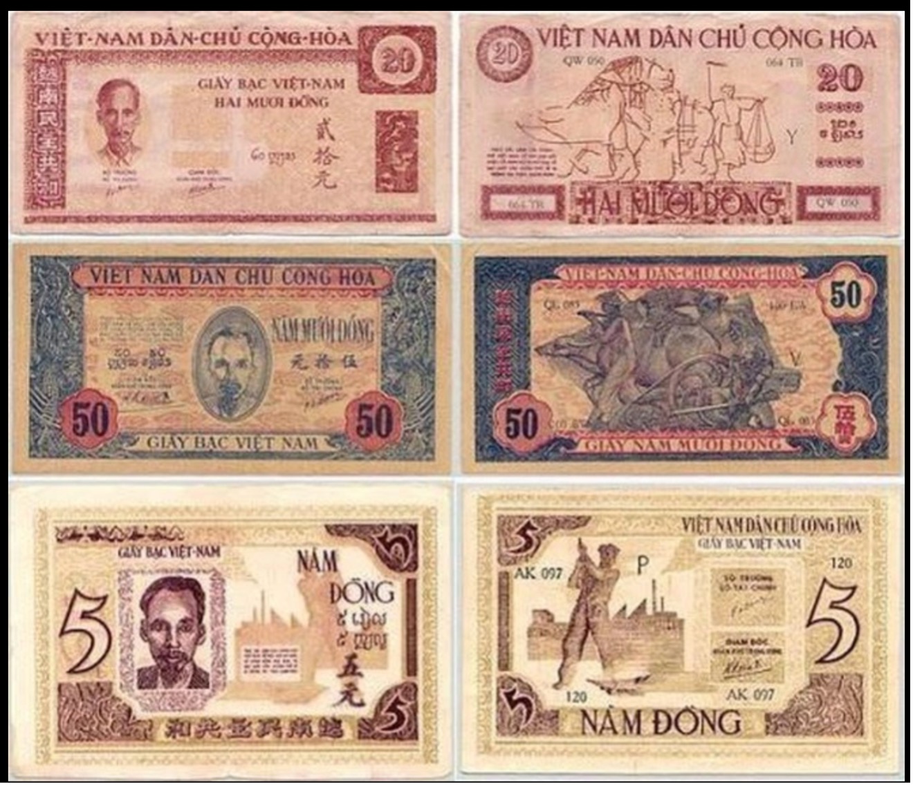 Các hình ảnh chủ yếu trên tờ tiền giấy thể hiện rõ tinh thần tự hào, độc lập của dân tộc ta với Quốc hiệu “Việt Nam Dân chủ Cộng hoà” và chân dung Chủ tịch Hồ Chí Minh được in trang trọng với góc nhìn chính diện trên nền hoa văn dân tộc như chim phượng, rồng, hình chữ triện… Các hoa văn này chủ yếu có phong cách trang trí thời Nguyễn. Motip trang trí chính theo kiểu khung trang trí, các hoạ tiết dày đặc tựa như trang trí đình làng với cấu trúc hai bên thẳng và trên dưới có các hoa văn cong tựa cửa võng.